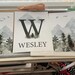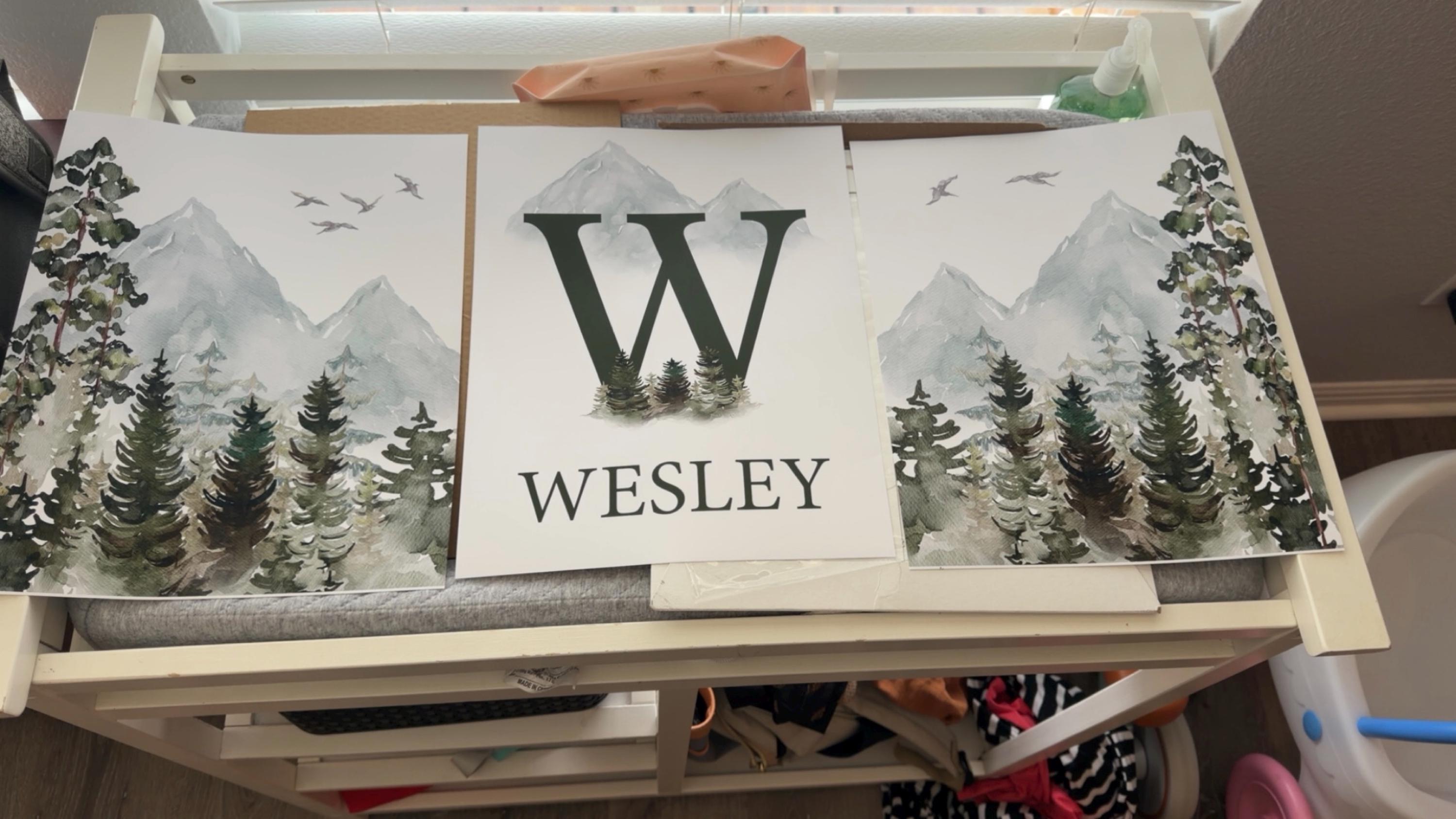 Create a calm, outdoors-inspired nursery with this personalized forest and woodland wall art set. Featuring soft watercolor mountains, pine trees, and birds in muted sage and forest green tones, this set includes: