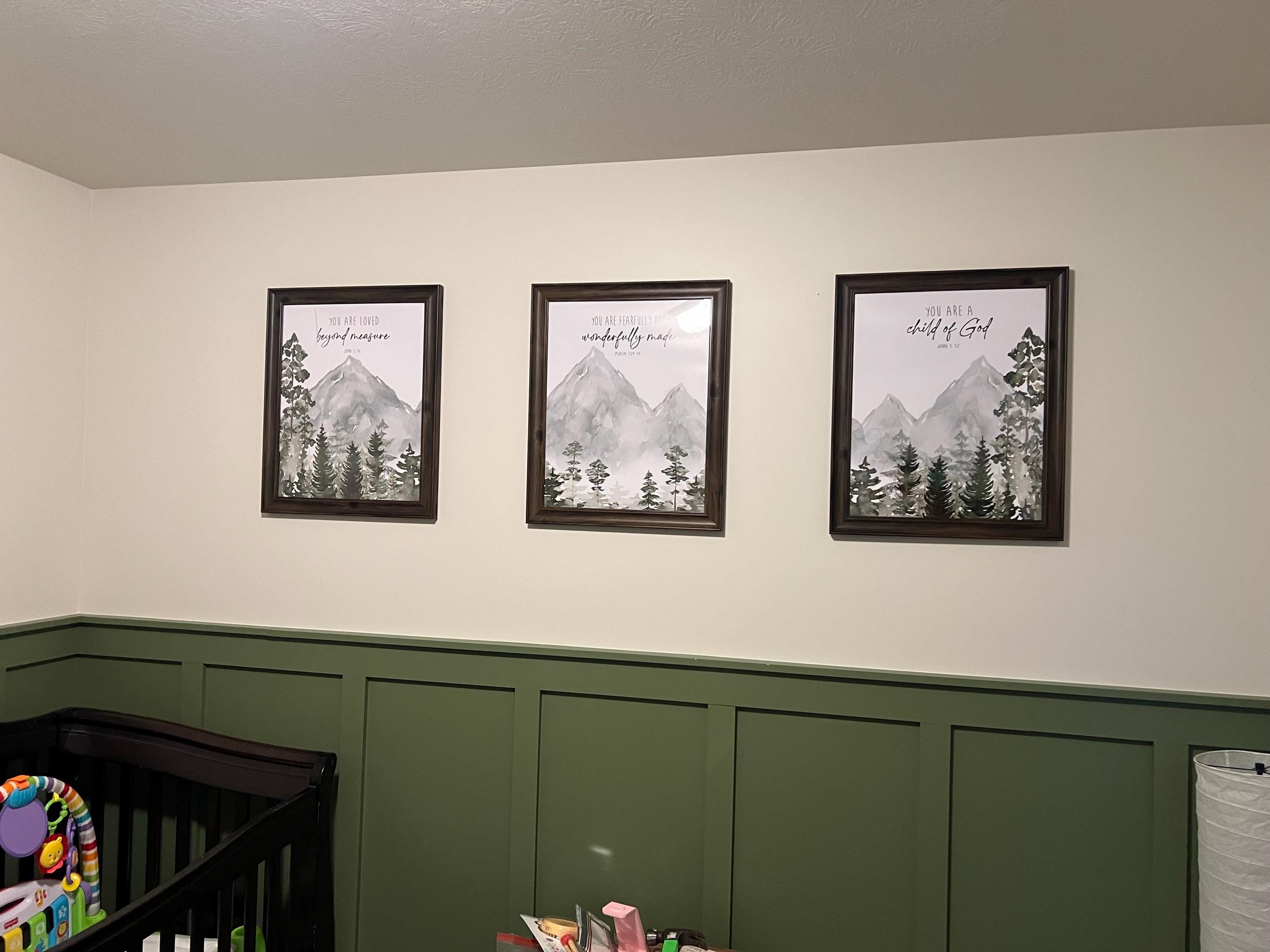 This Mountain Nursery Print Set features a forest and mountain landscape that spreads over three prints. Each print also features a bible scripture. The colors are various shades of deep and muted greens and gray. You will receive three prints, with each one measuring the size you select. This is available on photo paper (frames not included) or on canvas (ready to hang). Please select your preference at checkout.
