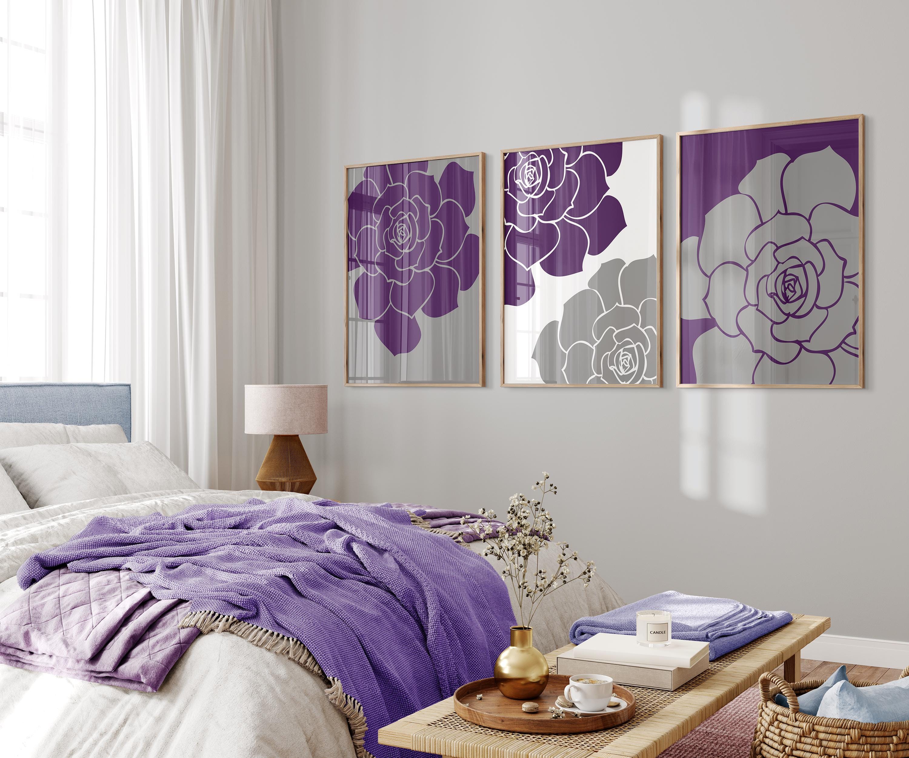 Purple & Gray Flower Prints, Modern Floral Bedroom Wall Art Set