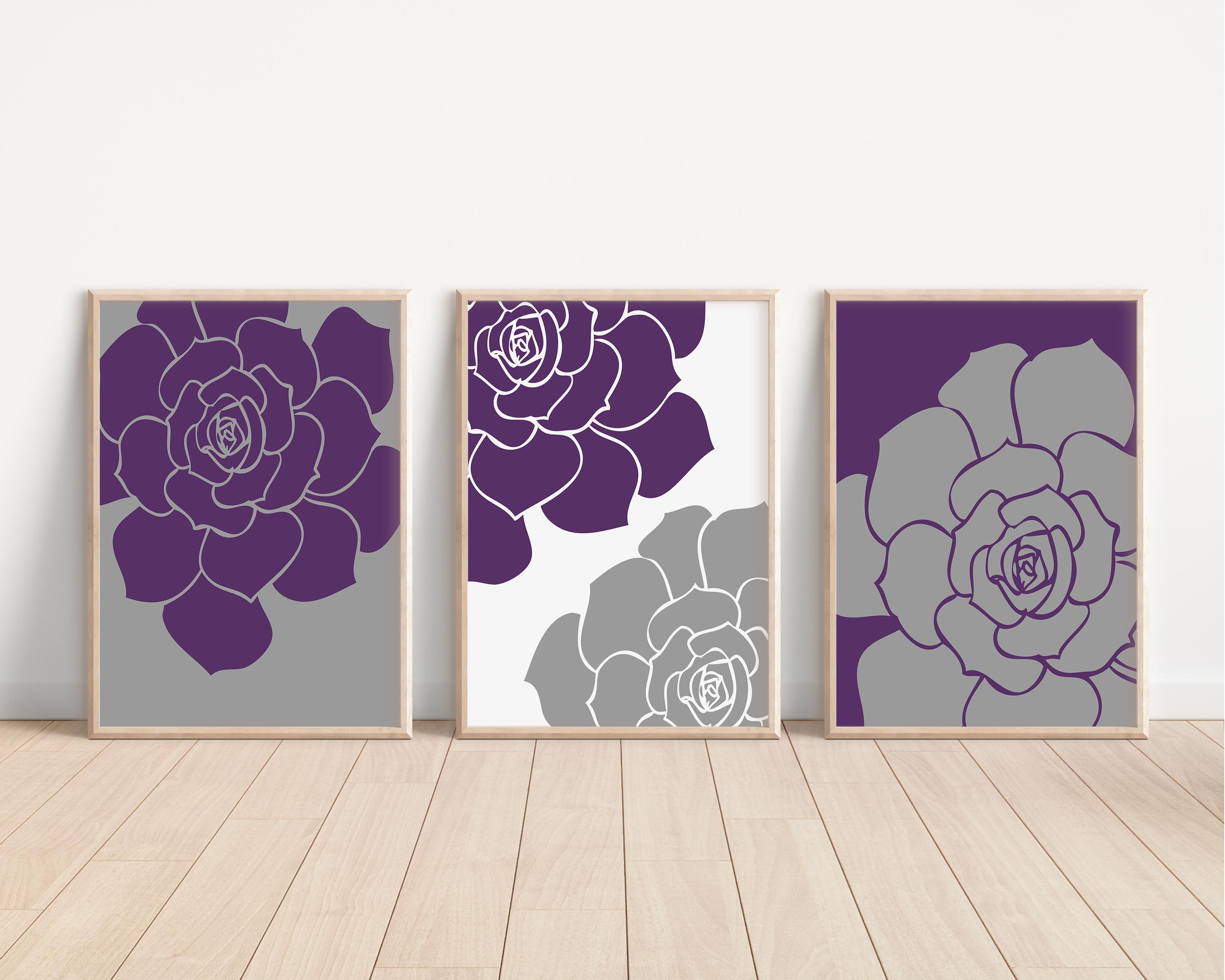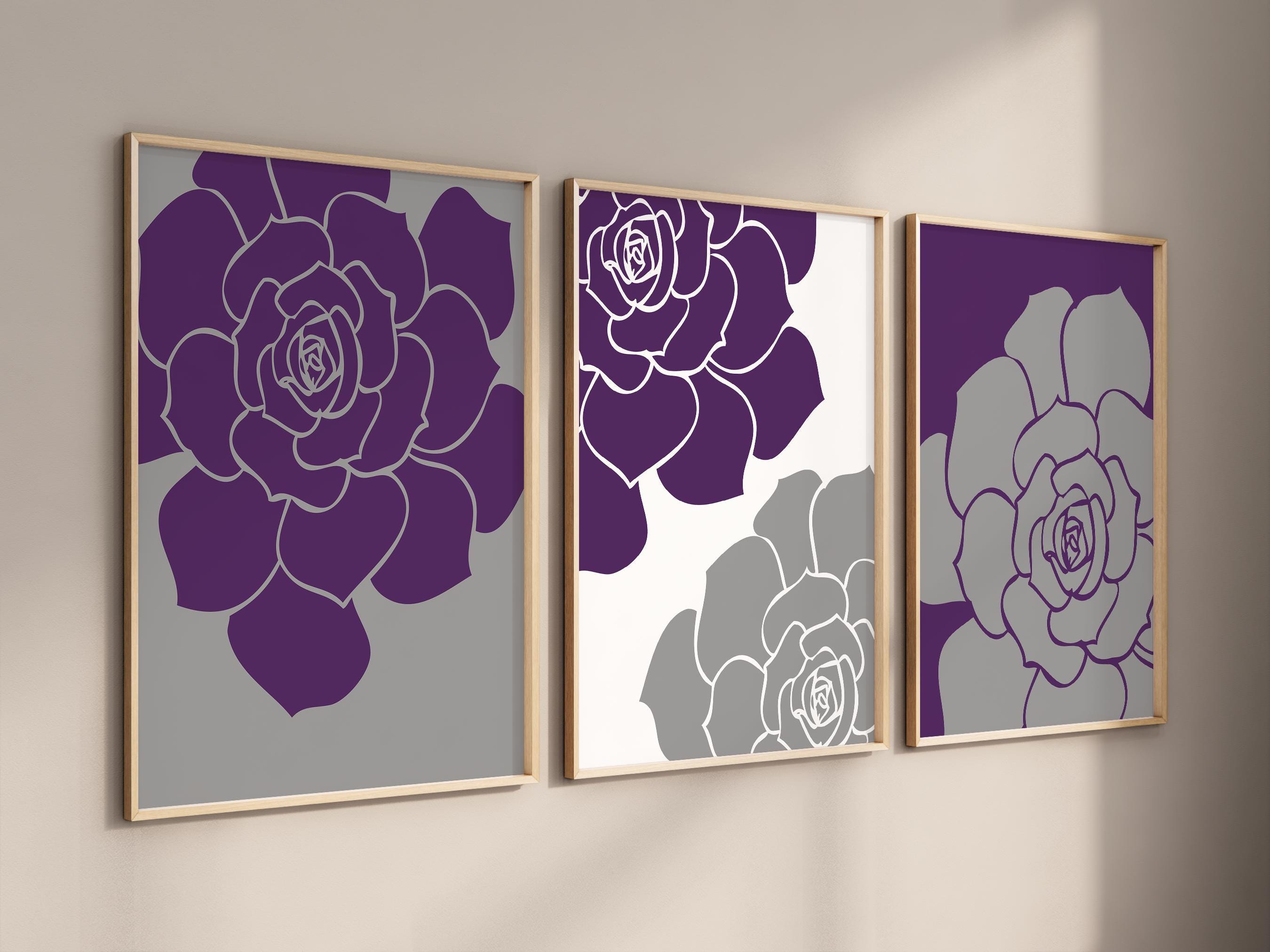 Make a bold statement with this modern floral wall art set. Featuring oversized purple floral designs paired with gray and white accents, this coordinated trio adds a contemporary touch to: