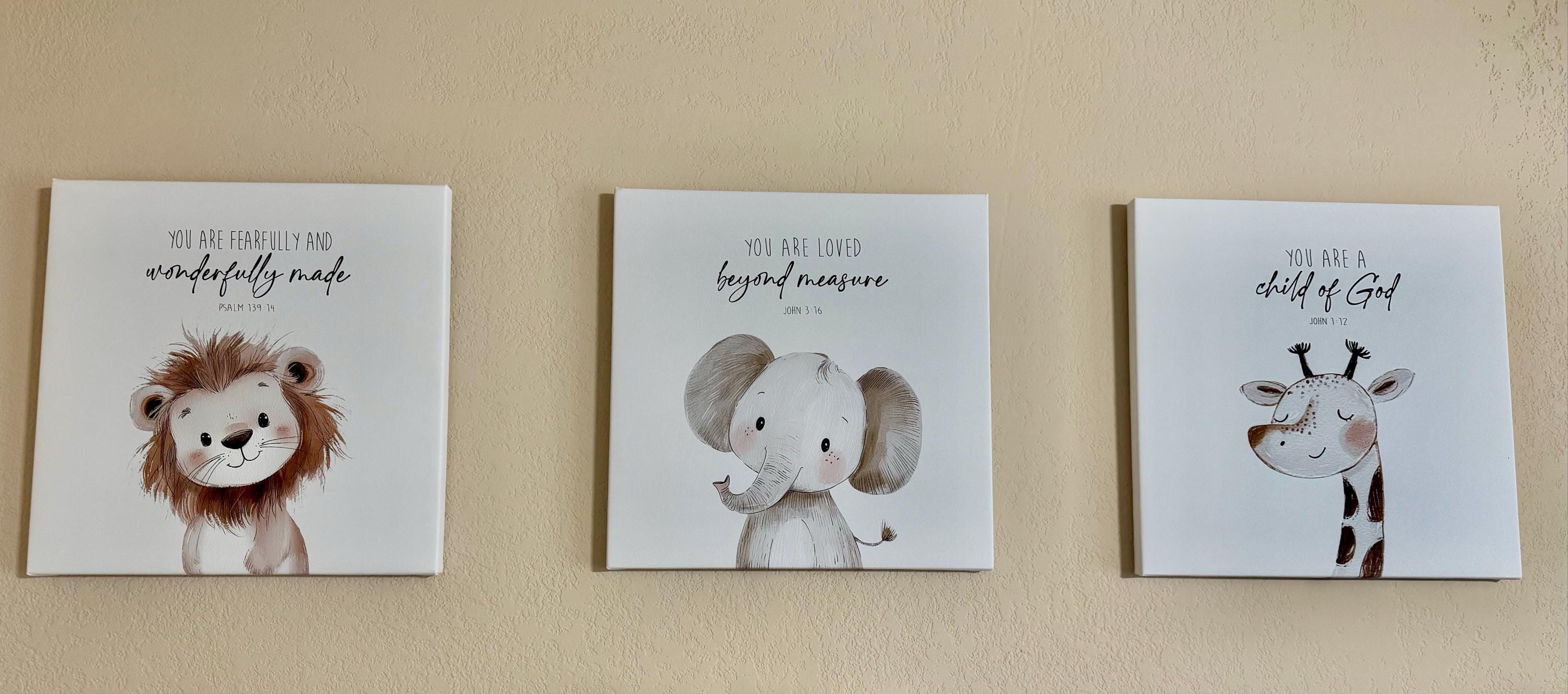 This baby bible verse nursery print set features three animals and a different scripture on each print. You will receive three prints, with each one measuring the size you select. This is available on photo paper (frames not included) or on canvas (ready to hang). Please select your preference at checkout.