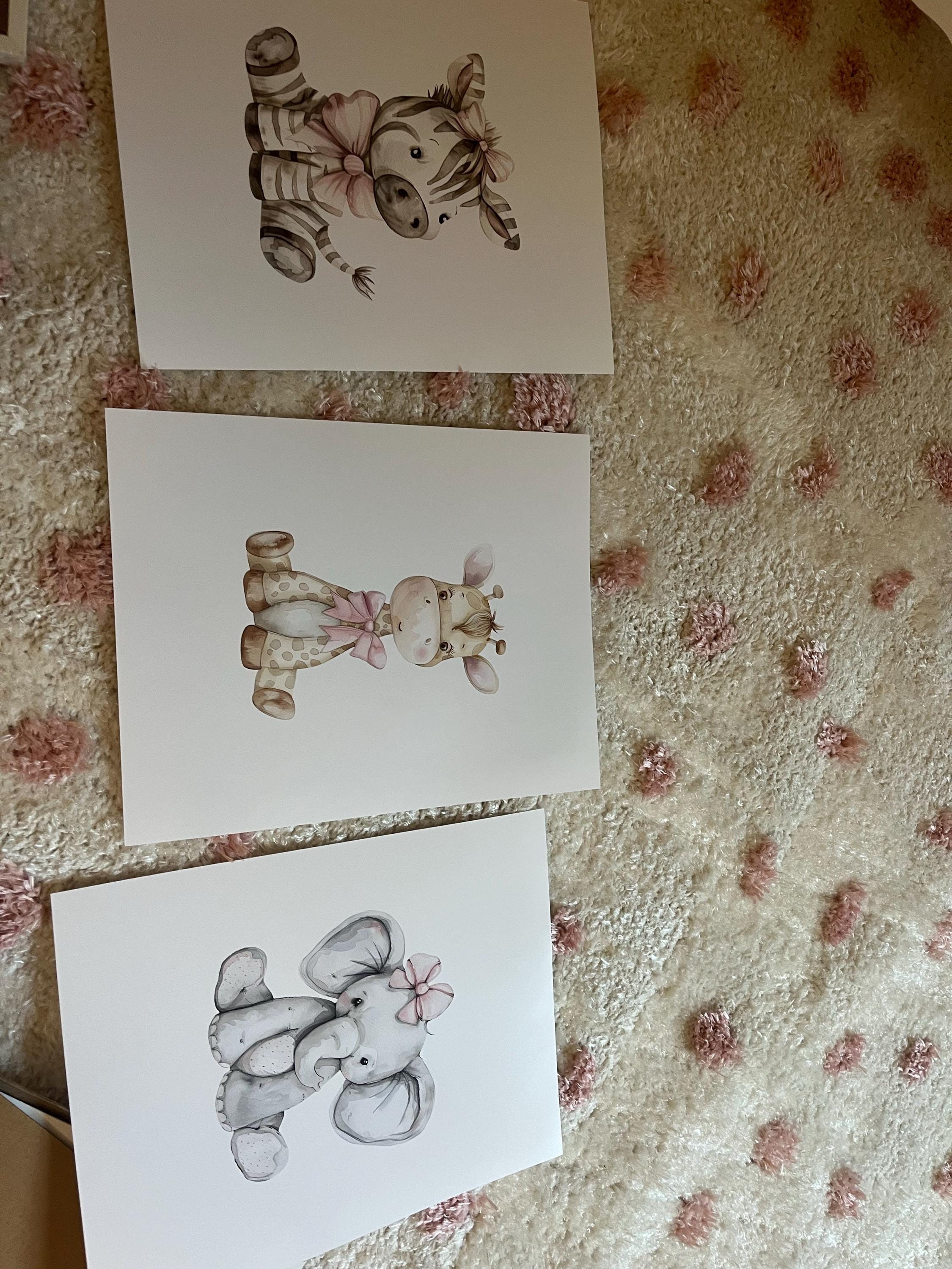 This three watercolor plush animal prints are a wonderful addition for your little girl's nursery or for your minimalist nursery. You will receive three prints, with each one measuring the size you select. Each print features a print of a zebra, elephant and giraffe with a pink bow on each animal. Please know frames are NOT included in either either the photo paper print option or the canvas option.