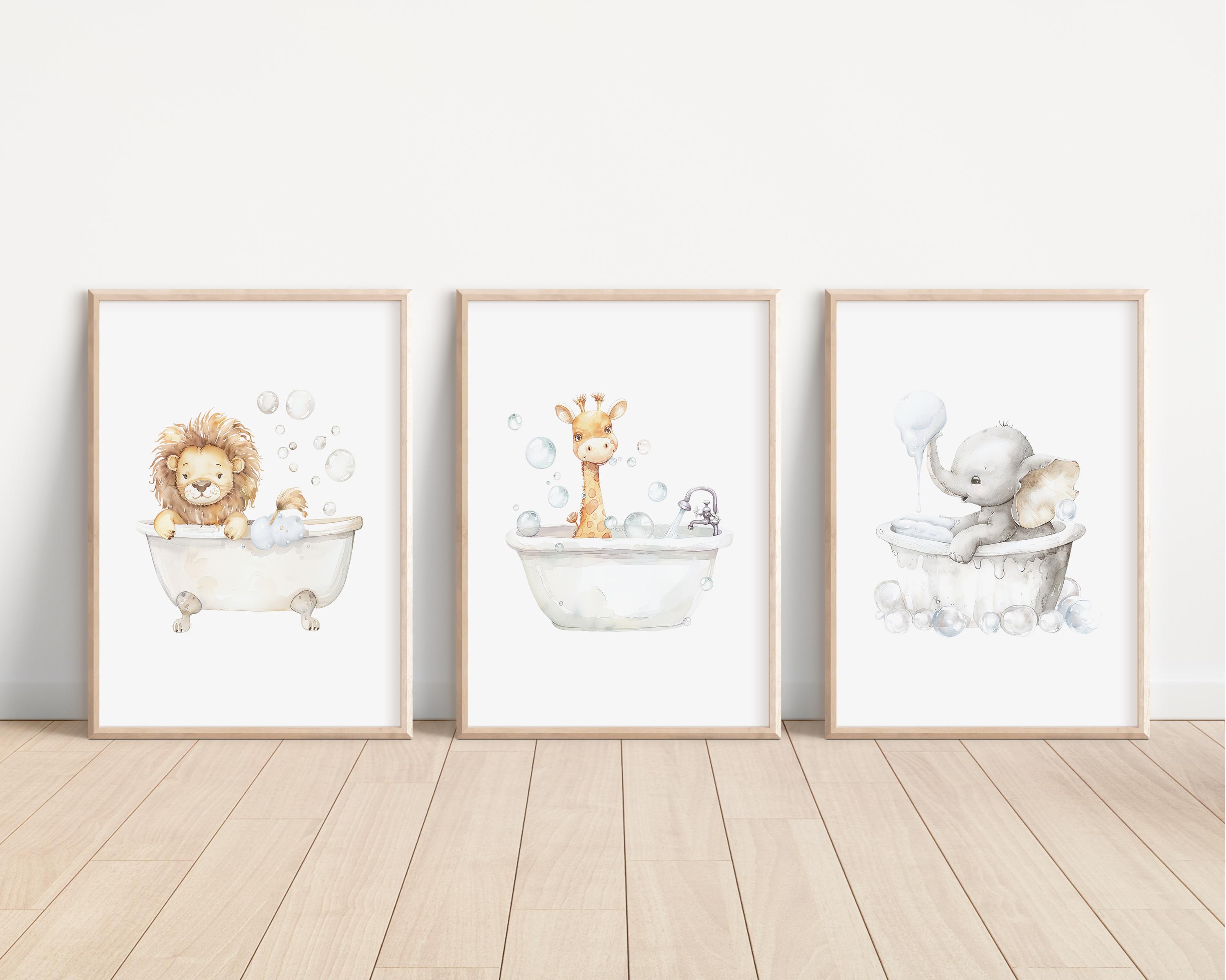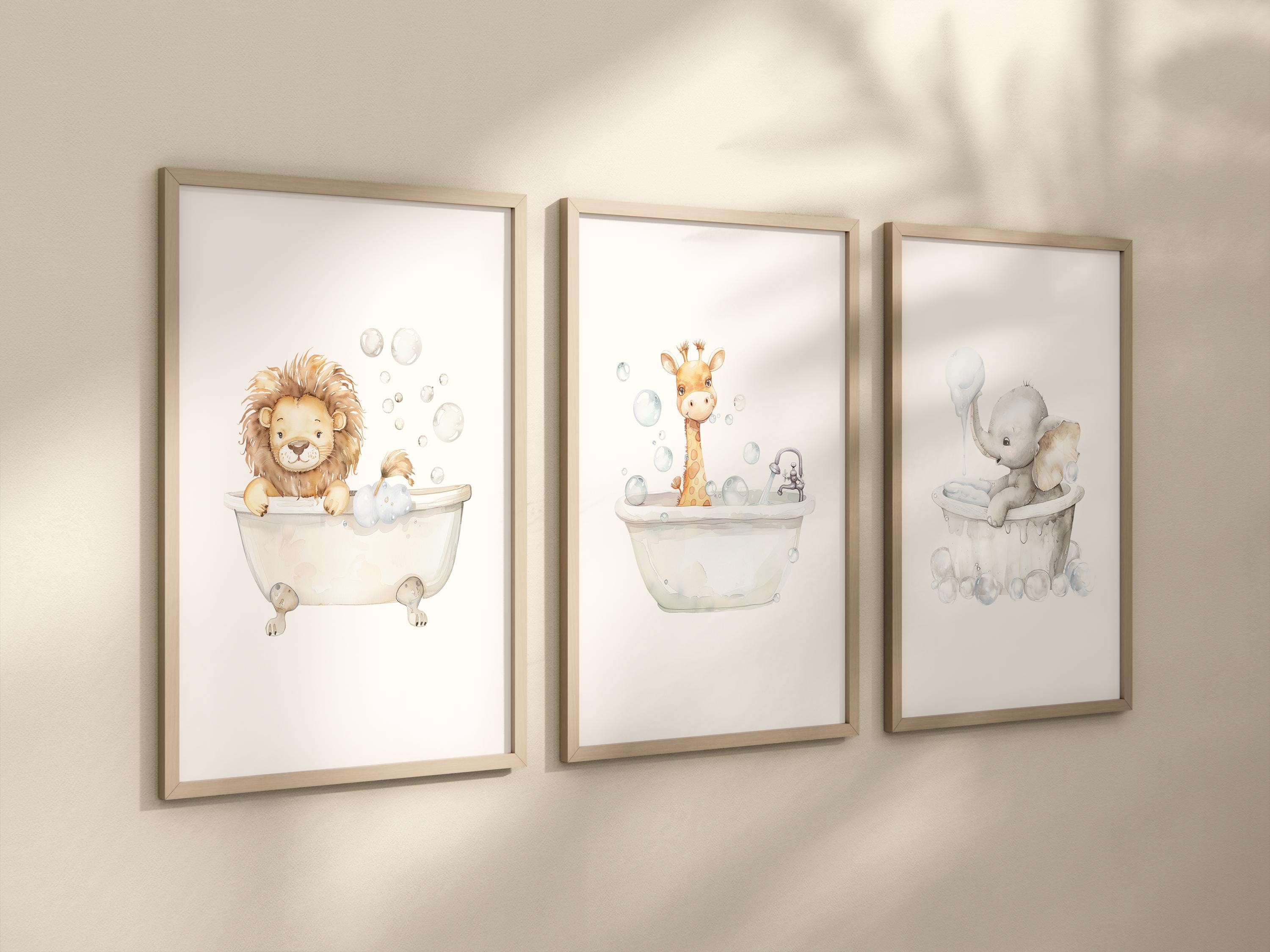 Safari Bathroom Wall Art Set, Lion Giraffe Elephant Prints, Bathroom Decor, Watercolor Animal Bathroom Art, Neutral Kids Bath Art