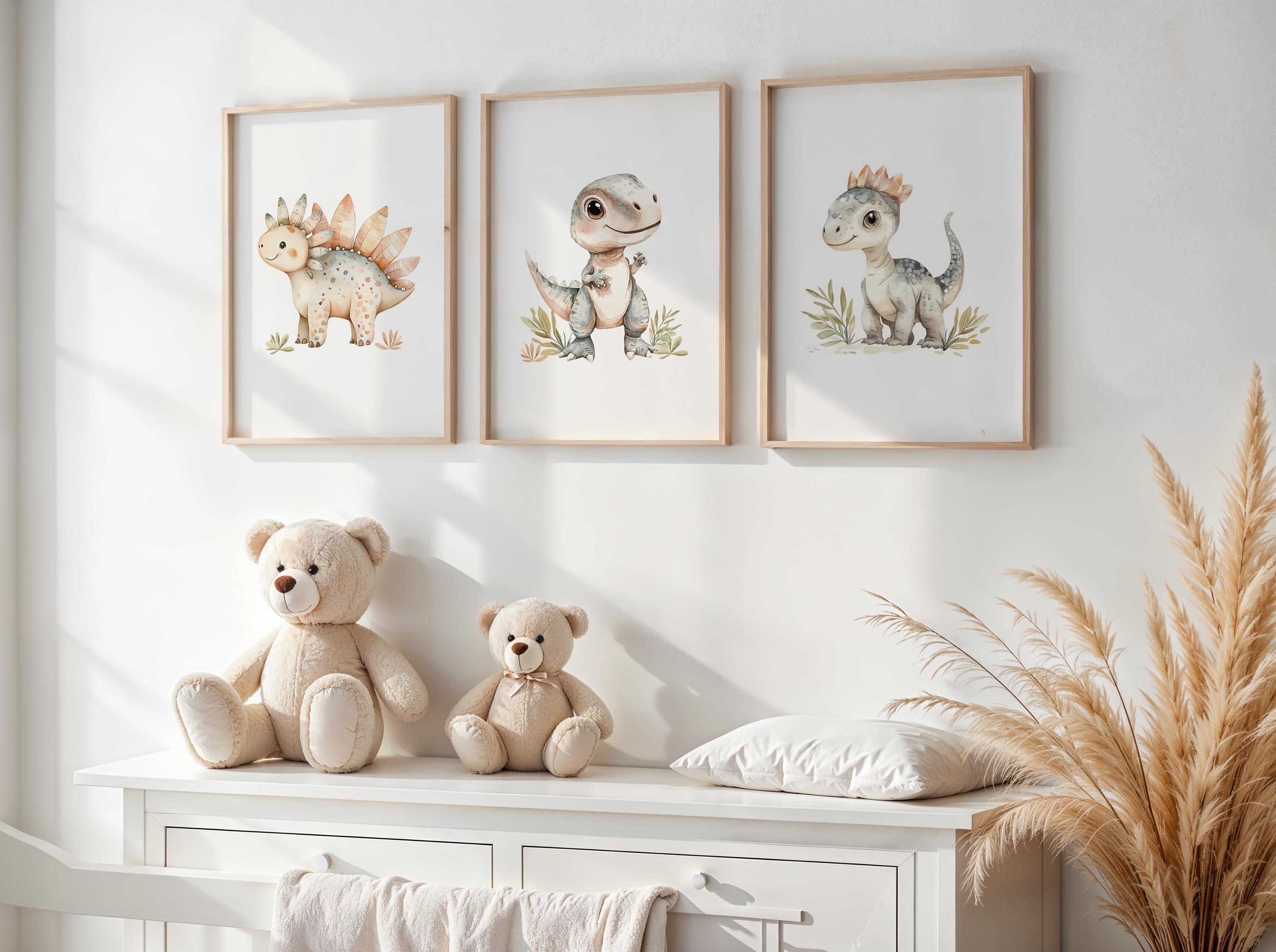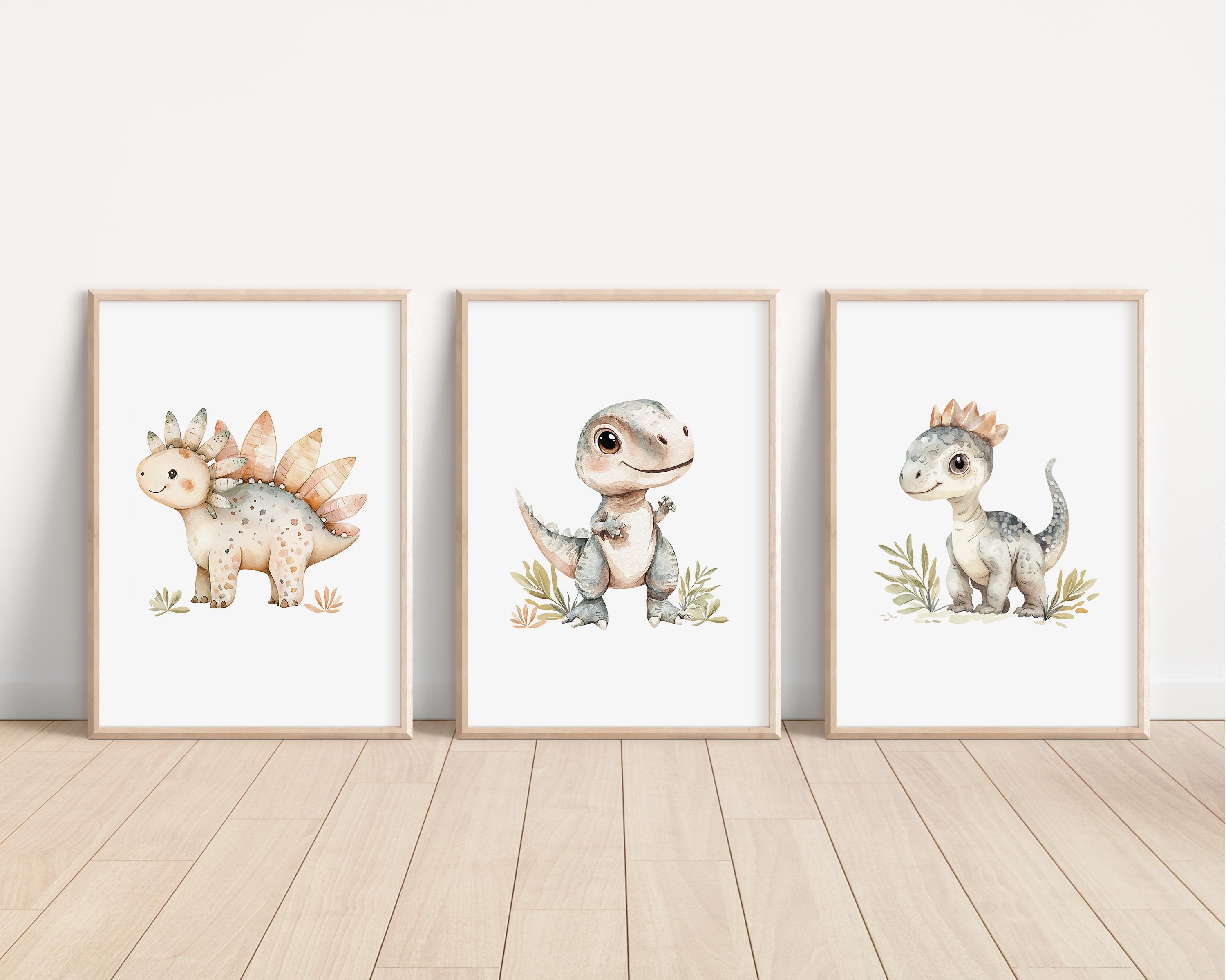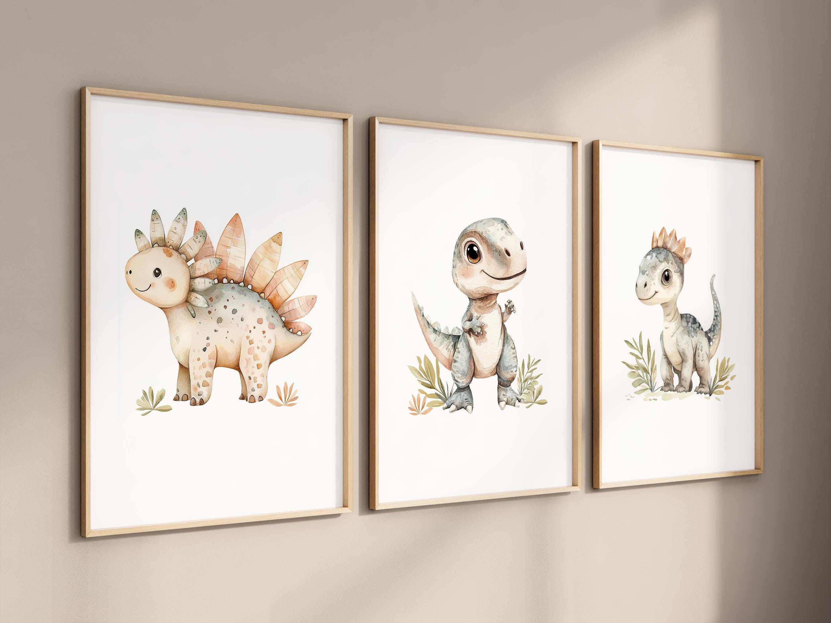 Bring a little prehistoric charm to your child’s space with this sweet set of three watercolor dinosaur prints! Featuring three adorable dinos in soft, neutral tones, this trio is perfect for a nursery, toddler room, playroom, or any space that needs a touch of cozy, whimsical fun.