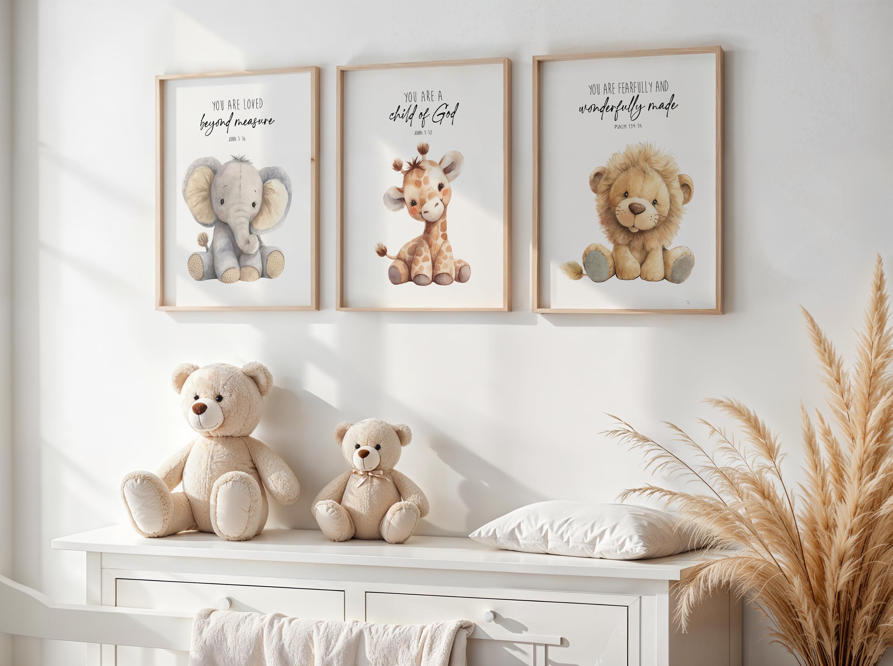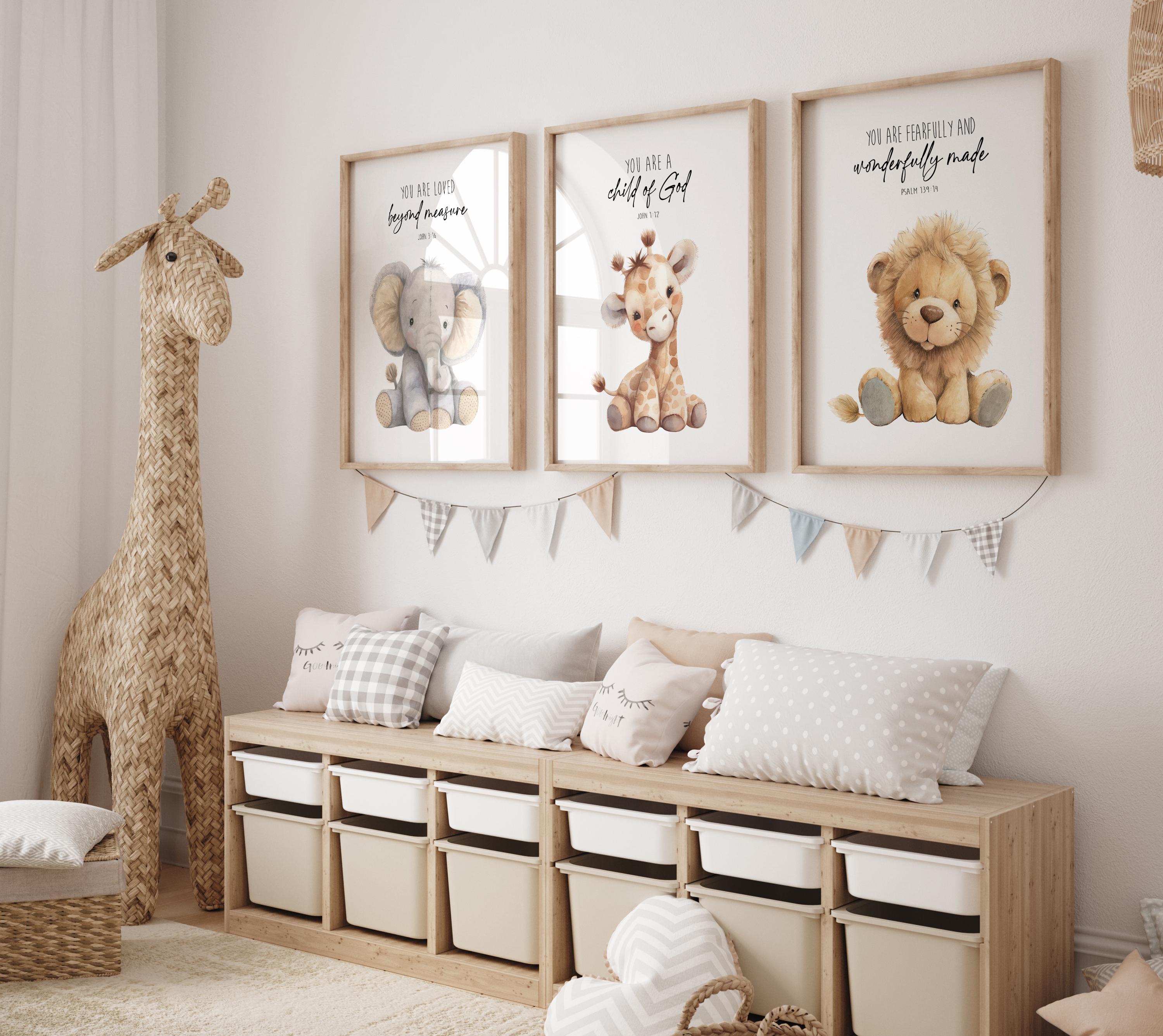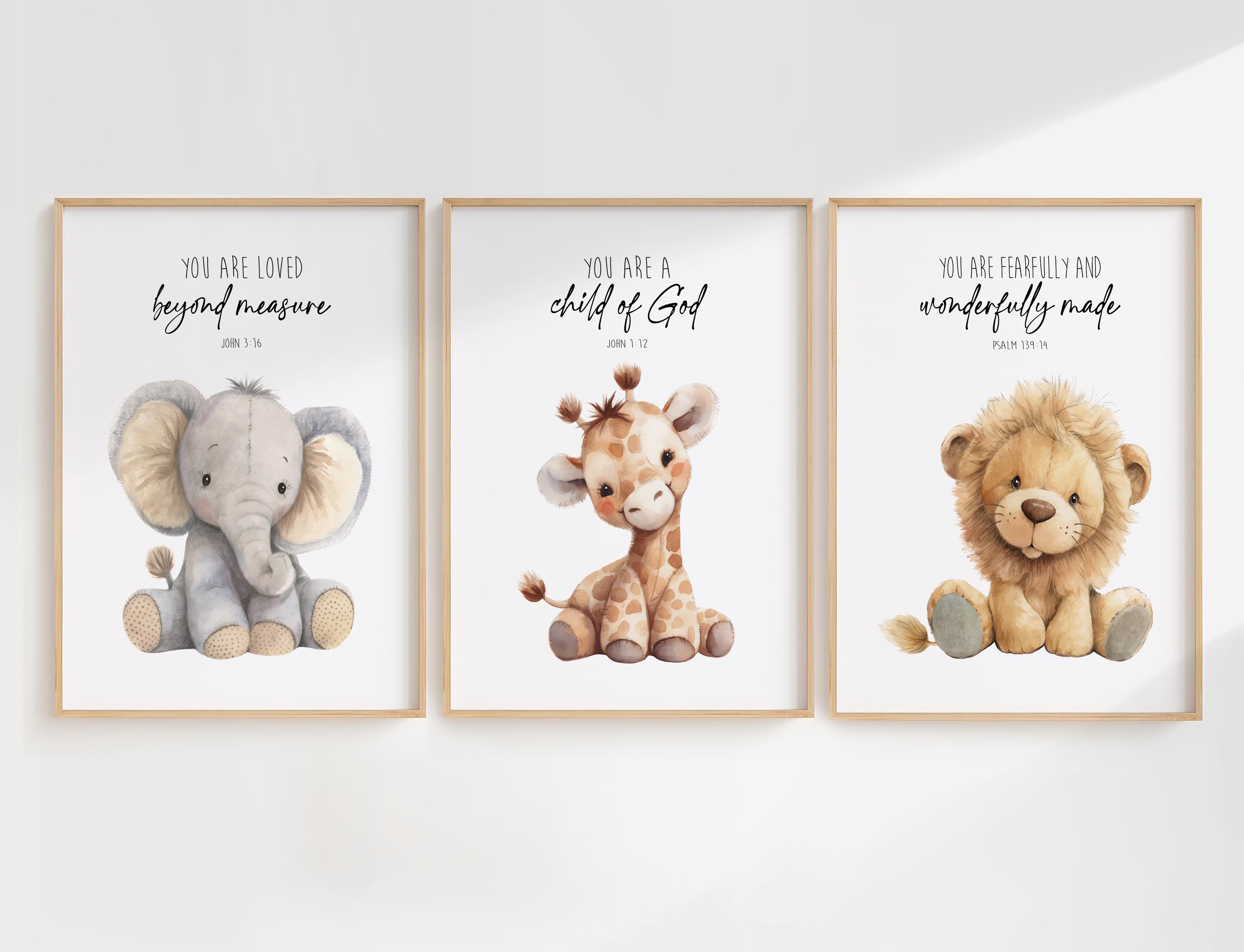 Create a sweet and meaningful space for your little one with this Christian safari nursery wall art set. This set of three prints features an adorable elephant, giraffe, and lion paired with uplifting Bible verse affirmations, making it a beautiful addition to a baby boy nursery, neutral nursery, or faith-based children's room.